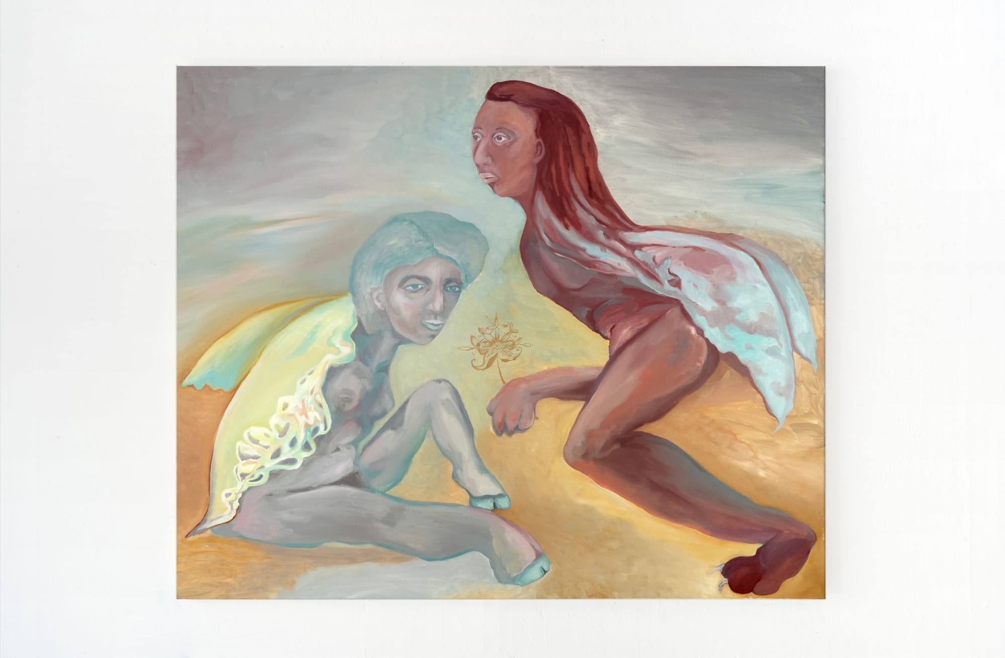 Their most recent painting, Esfinges (“Sphinxes”), shows two hybrid female-beast figures bathed in soft, ethereal tones. One crouches, wings cloaked in lemon yellow next to her partner, a red clawed woman who stares off into the distance. While different in coloring, expression, and animal qualities (one has cloven feet while the other massive paws) the two are intrinsically linked, with an obvious union in their mythical world. This painting exemplifies Isa and María's relationship: two artistic voices coming together to build their own queer and magical reality.